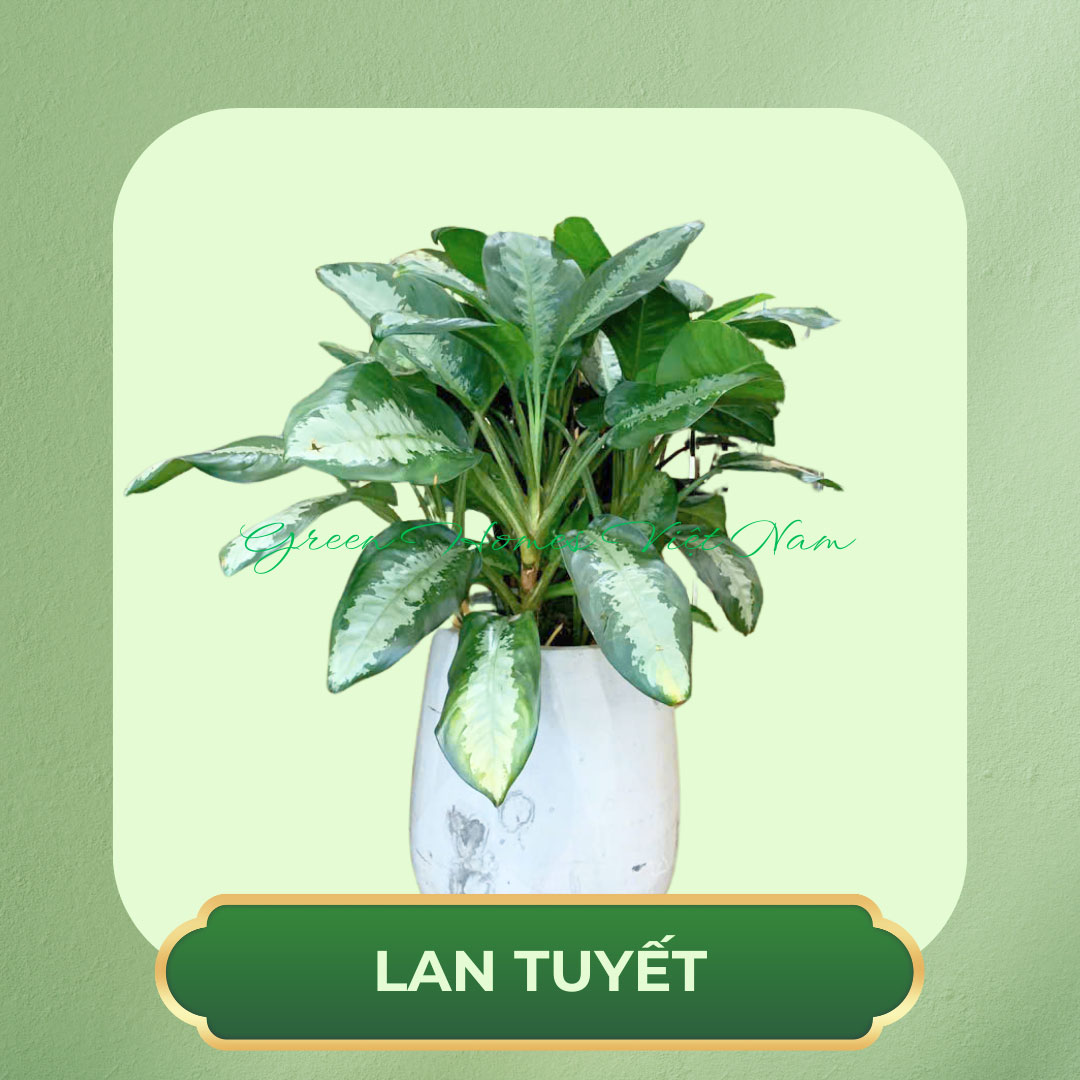 Cây lan tuyết có nguồn gốc từ Châu Á nhiệt đới, thuộc họ Ráy, mọc thành bụi. Cây có chiều cao trung bình từ 30 – 100cm. Lá hình bầu dục, nhọn hai đầu, trông khá giống cây bạch mã hoàng tử, nhưng sống lá màu xanh, phiến lá có màu xanh nhạt đặc biệt. Thân cây gỗ có đốt, phân nhánh dưới gốc tạo thành bụi nhỏ. Cây khoẻ, có dáng thẳng, lá đẹp, cứng cáp.