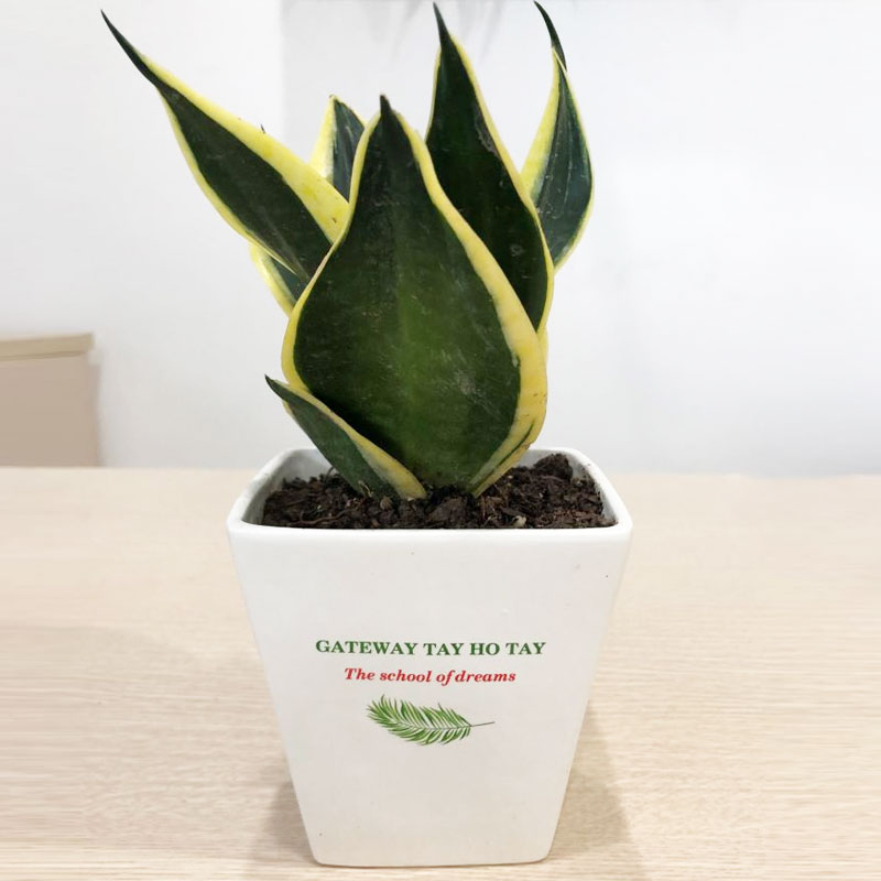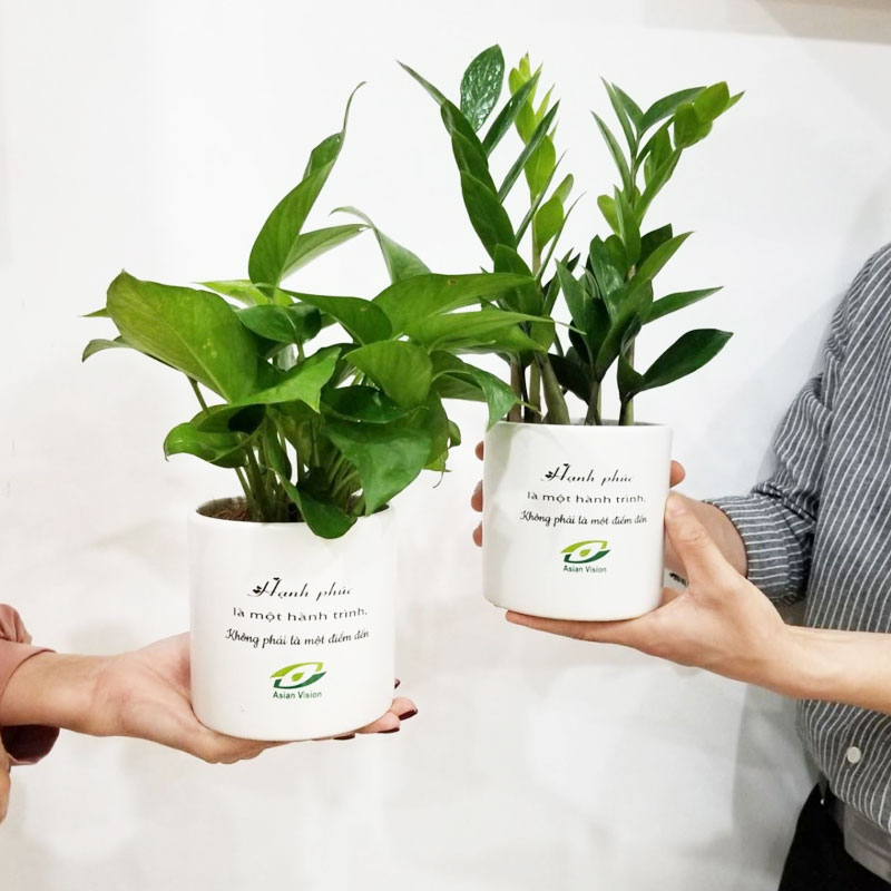 Chậu cây làm bằng men sứ hoặc composite, cỡ nhỏ, màu sắc tùy ý, trên thân chậu in thông điệp của sự kiện, được thiết kế đẹp mắt, ấn tượng, chậu trồng những khóm cây nhỏ tùy lựa chọn, thông thường là Phú quý, Kim phát tài, Tài lộc, Lan chi,... Điểm nhấn của sản phẩm chính là phần thông điệp của sự kiện mà người tổ chức muốn truyền tải đến cho người tham dự.